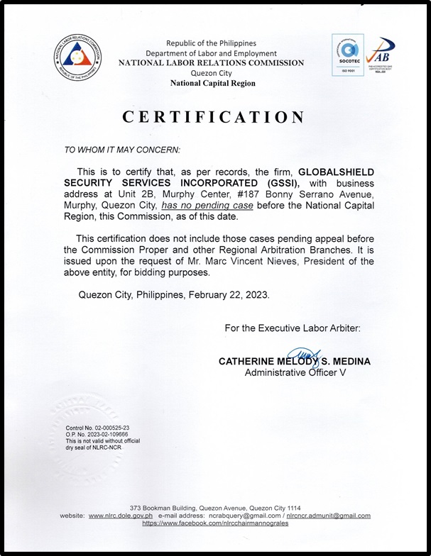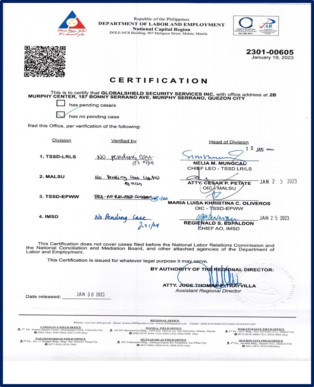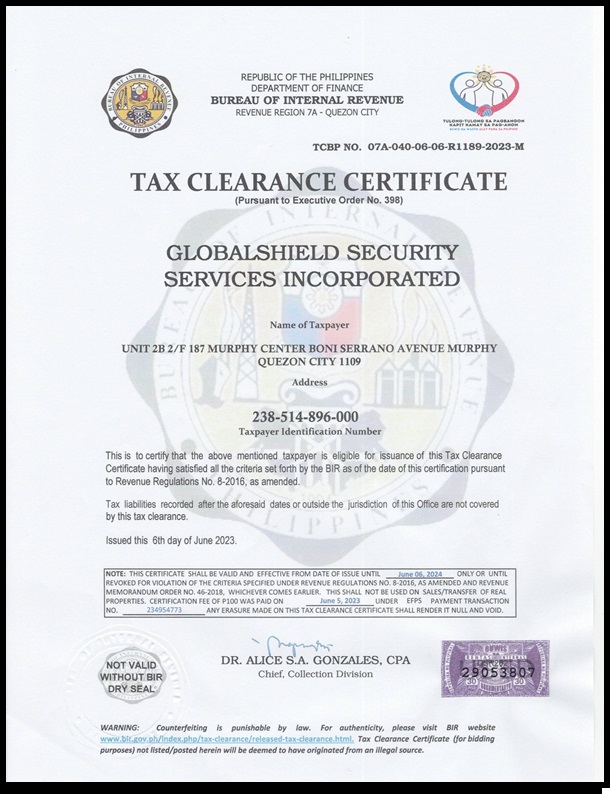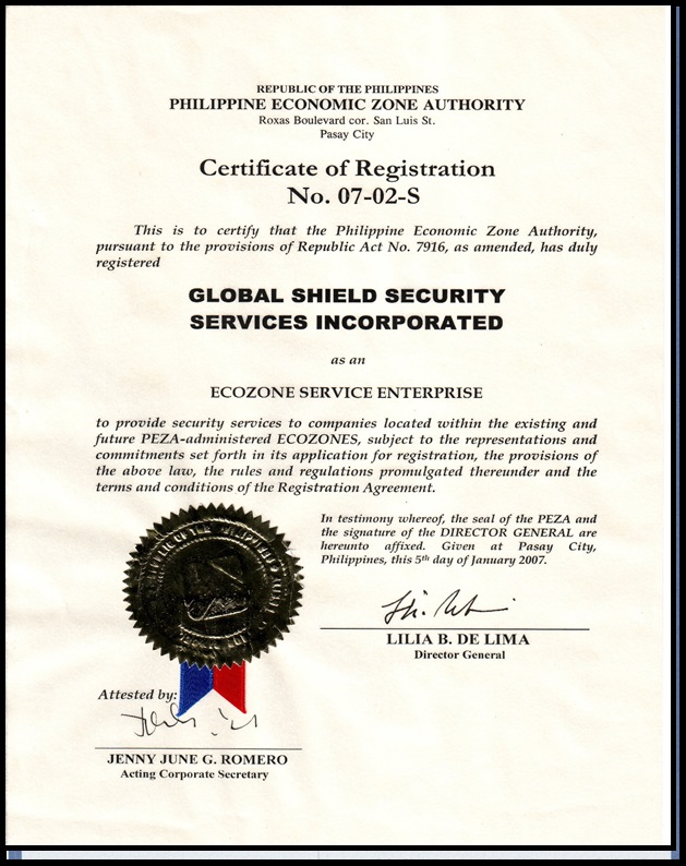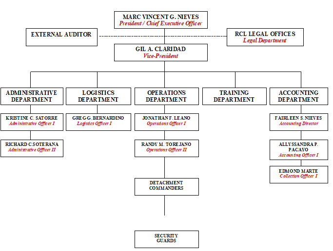“To protect and secure the lives and properties of the clientele through globally competitive security program founded on sound security policies.”